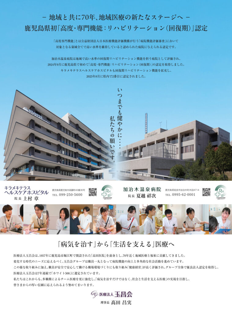 本広告では、加治木温泉病院およびキラメキテラスヘルスケアホスピタルが取得した「高度・専門機能:リハビリテーション(回復期)」認定をはじめ、地域医療への貢献と今後の展望についてご紹介しています。